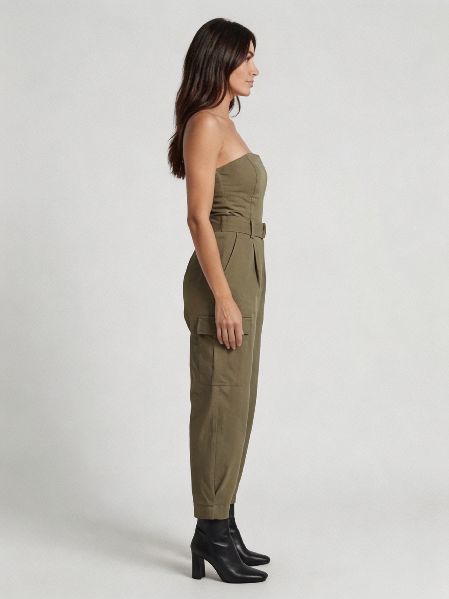 Affirmez votre personnalité avec notre combinaison bustier cargo kaki, une pièce audacieuse qui fusionne élégance et esprit utilitaire. Son design moderne et structuré en fait l'alliée parfaite pour un look affirmé et tendance.