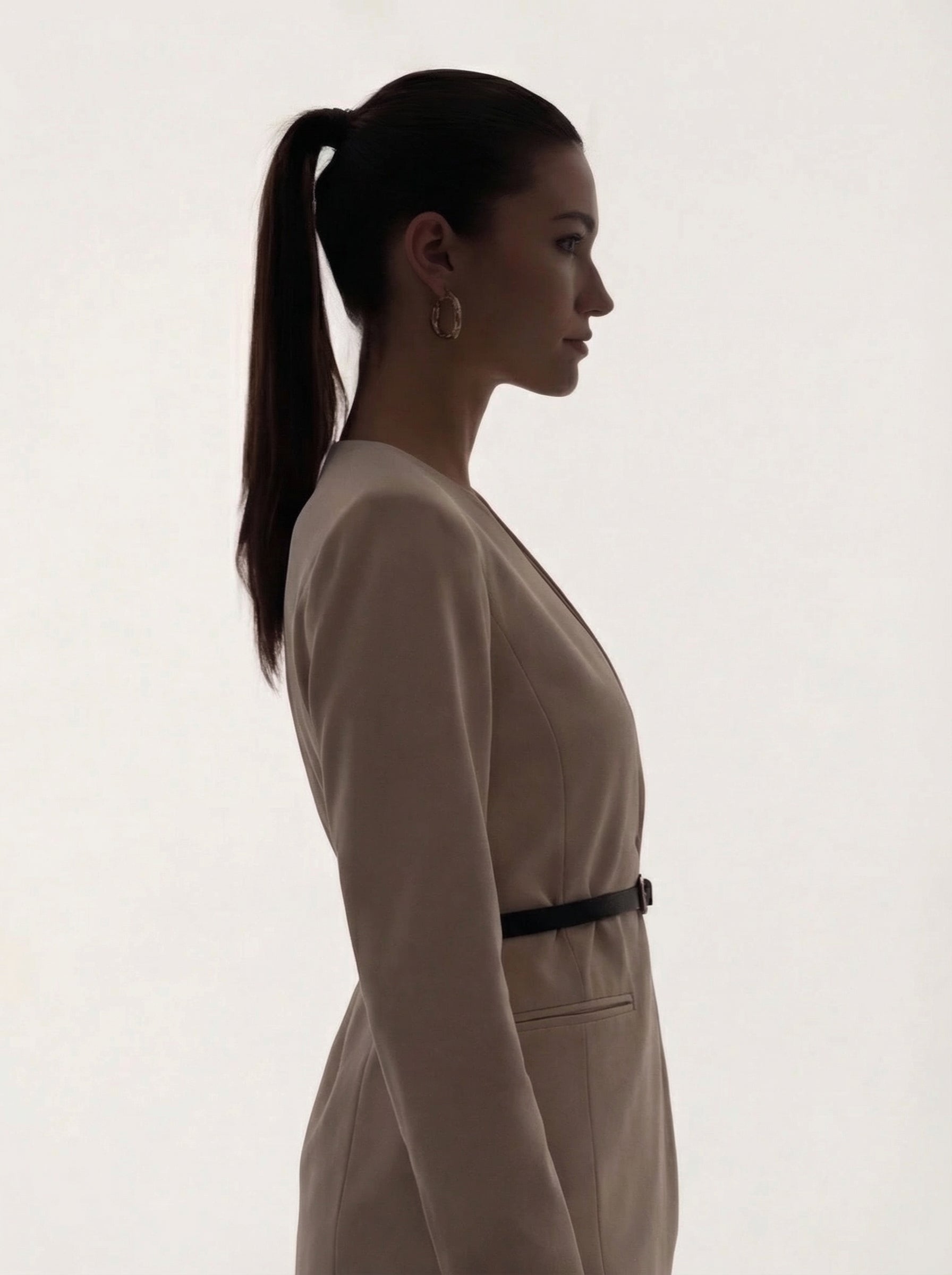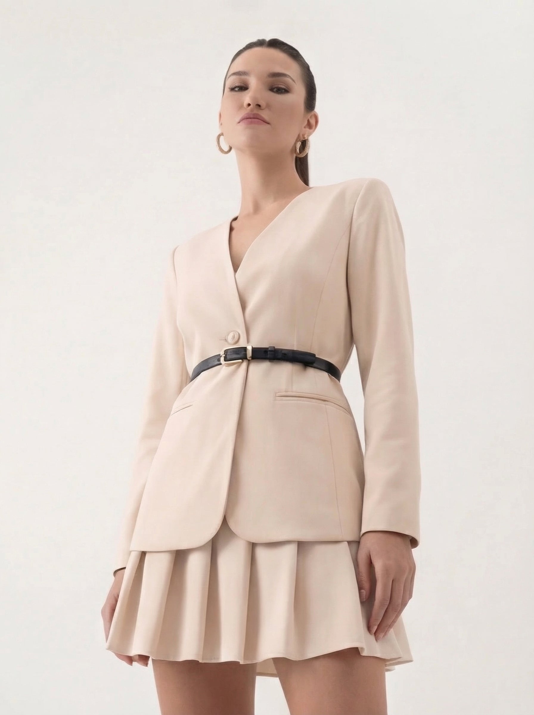 - Blazer à col V structuré : Une coupe épurée qui sublime la silhouette avec élégance