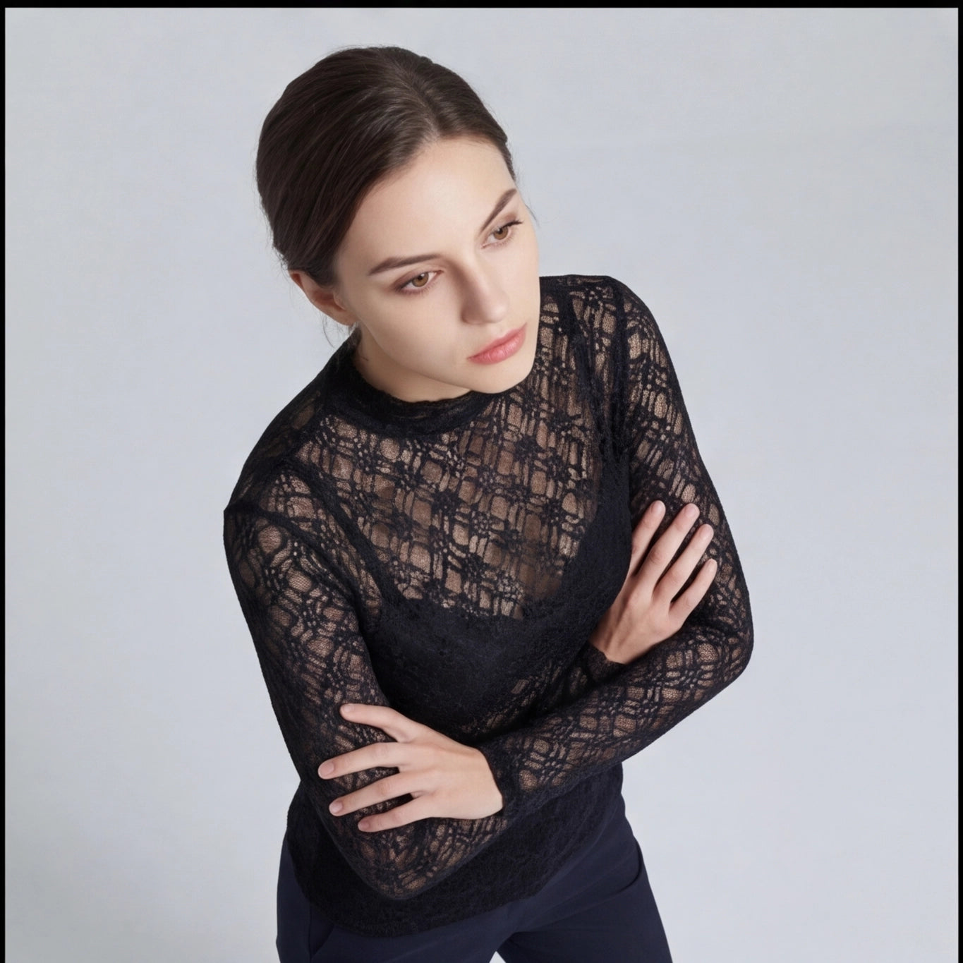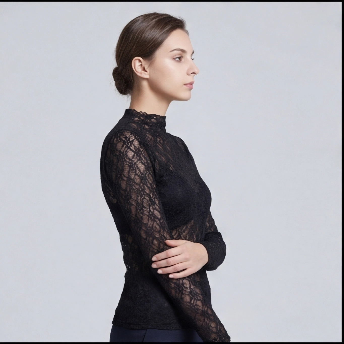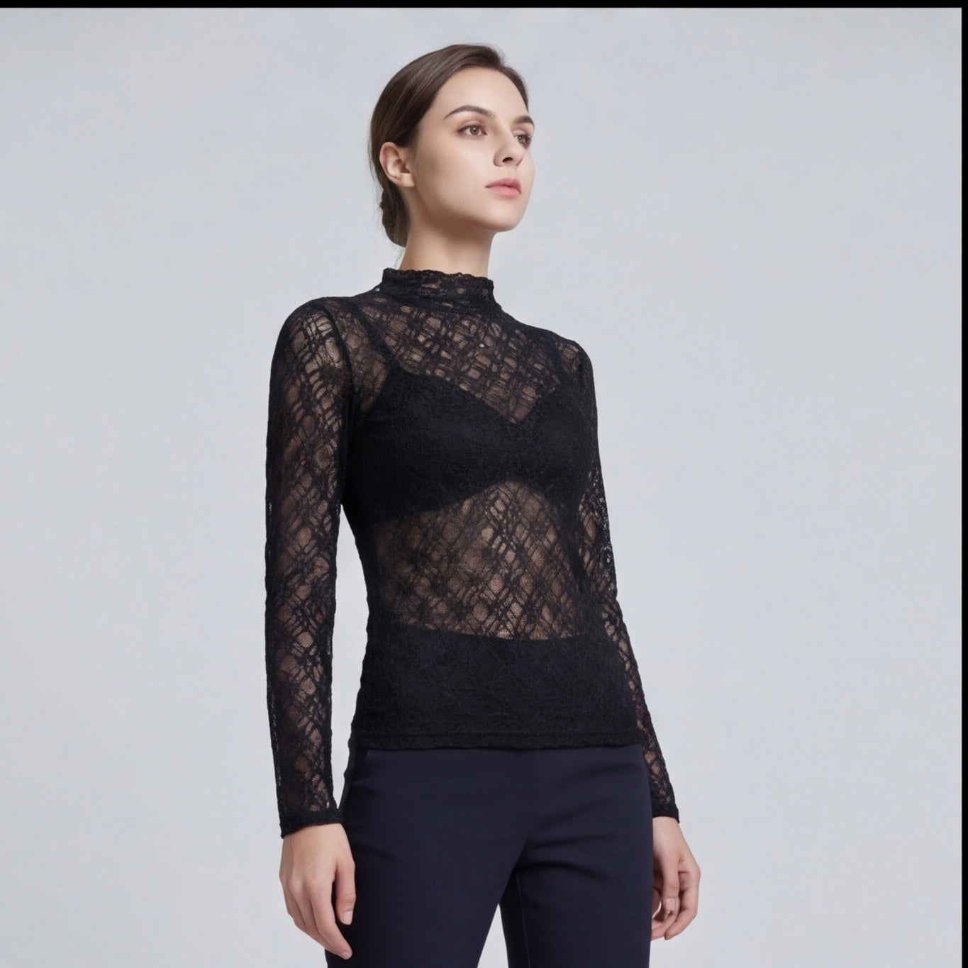 Top en dentelle noire à col légèrement montant – manches longues