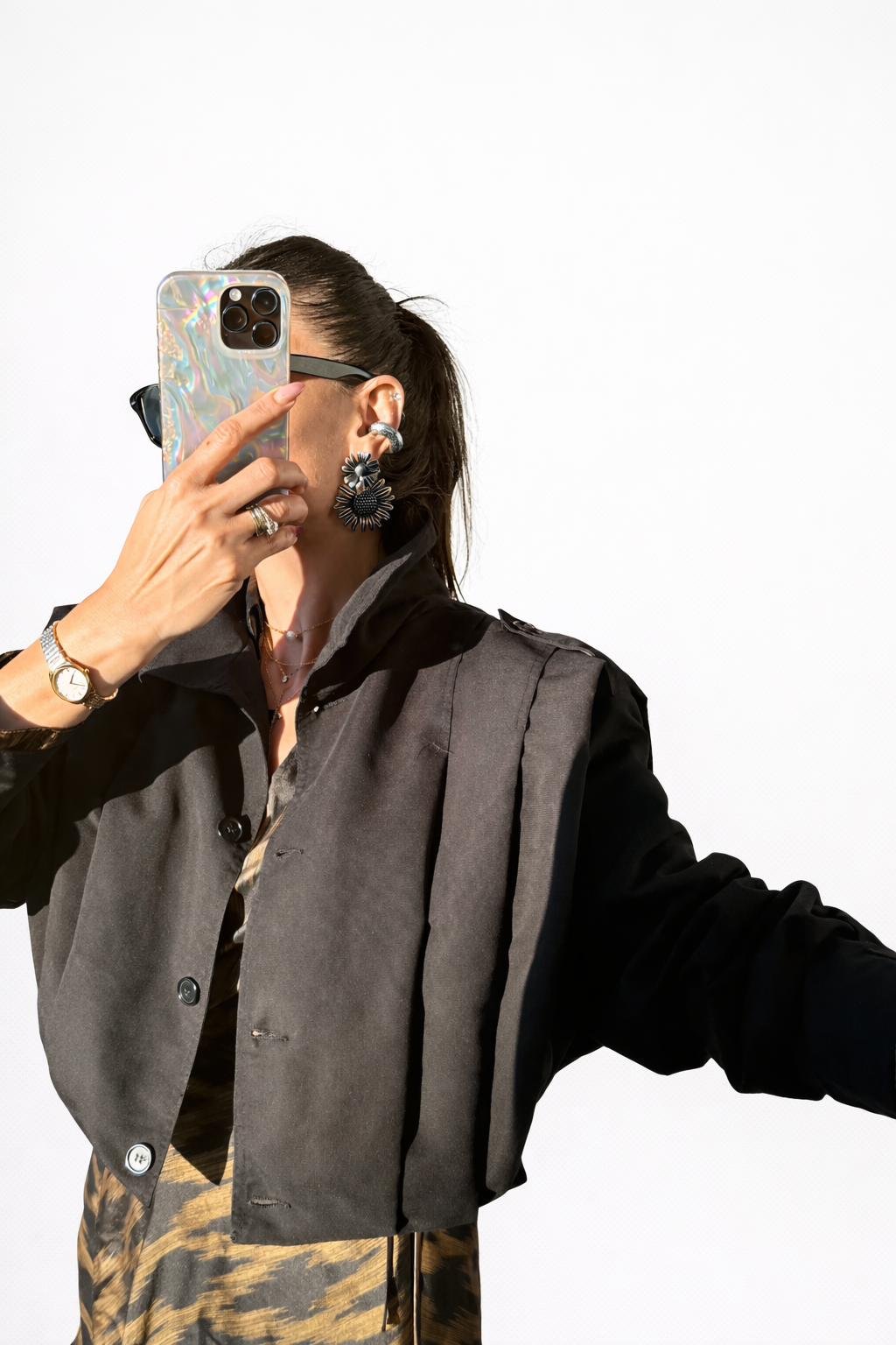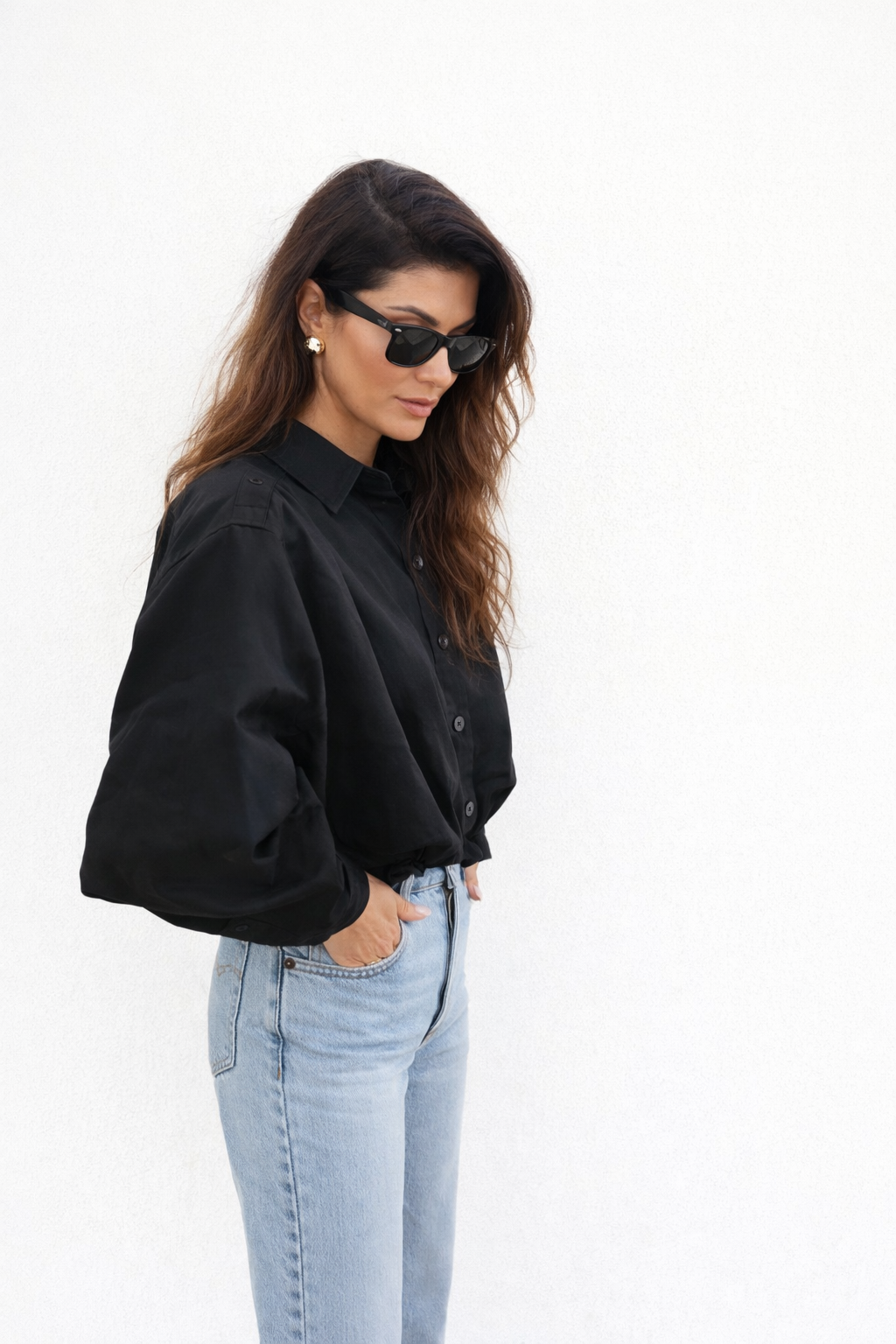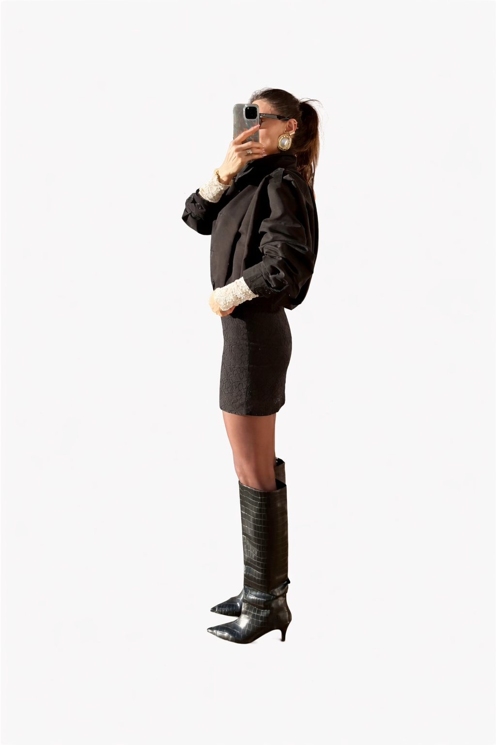 Adoptez une allure moderne avec notre veste courte noire à épaulettes, une pièce au style structuré qui apporte caractère et sophistication à toutes vos tenues. Son design affirmé et sa coupe impeccable en font un essentiel de votre garde-robe.