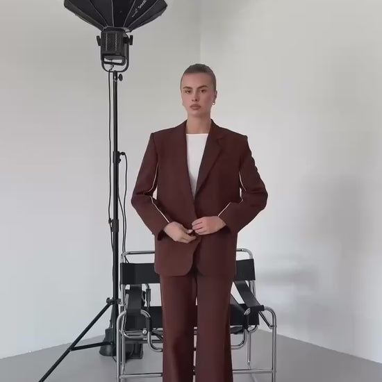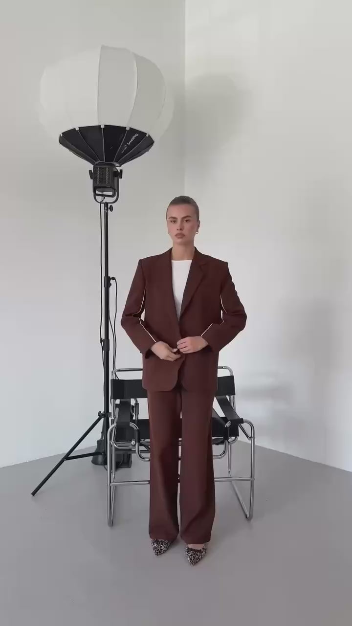 Découvrez notre tailleur marron aux manches rayures, une pièce sophistiquée qui allie le classique au contemporain. Parfait pour la femme moderne qui recherche l'élégance sans compromis.