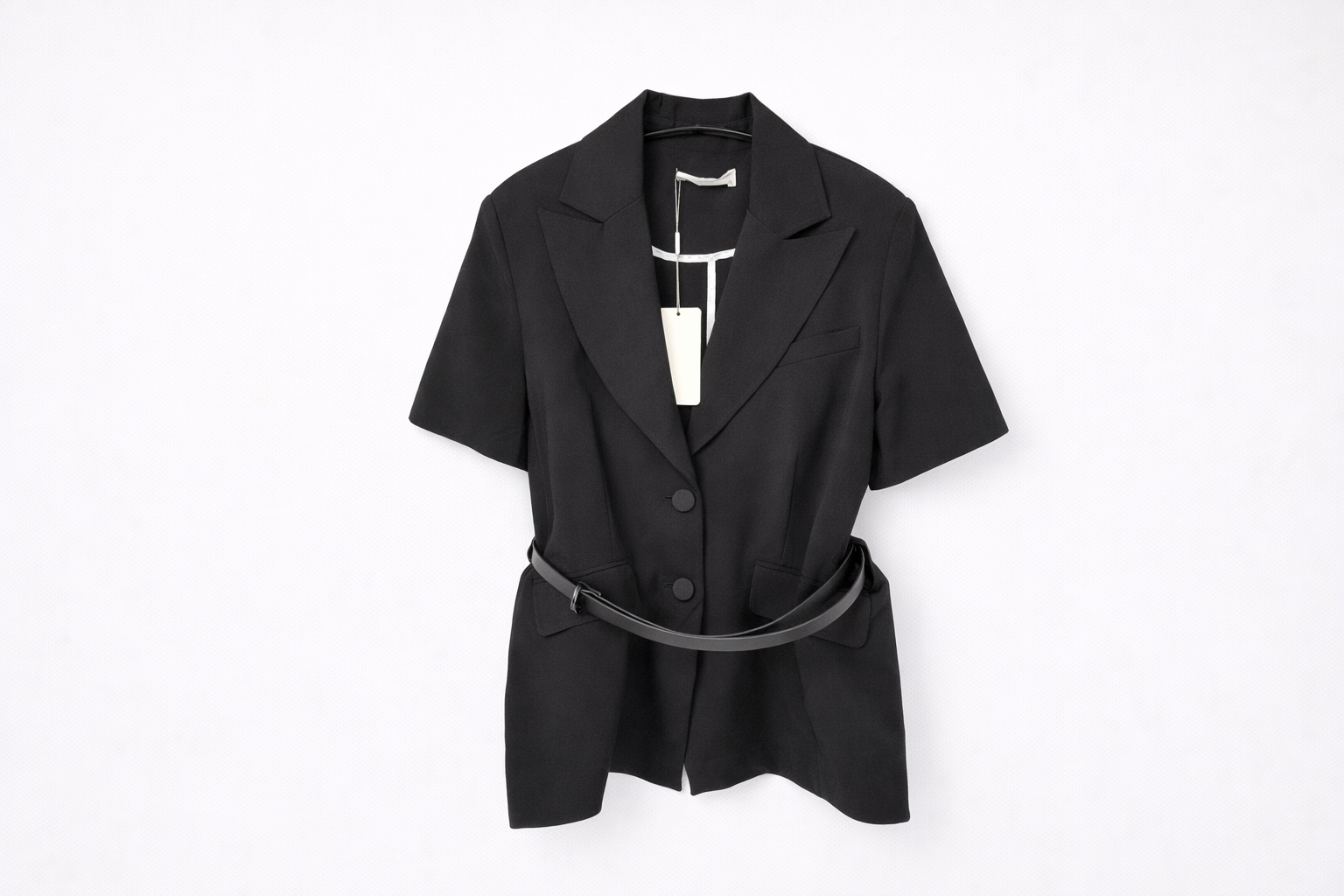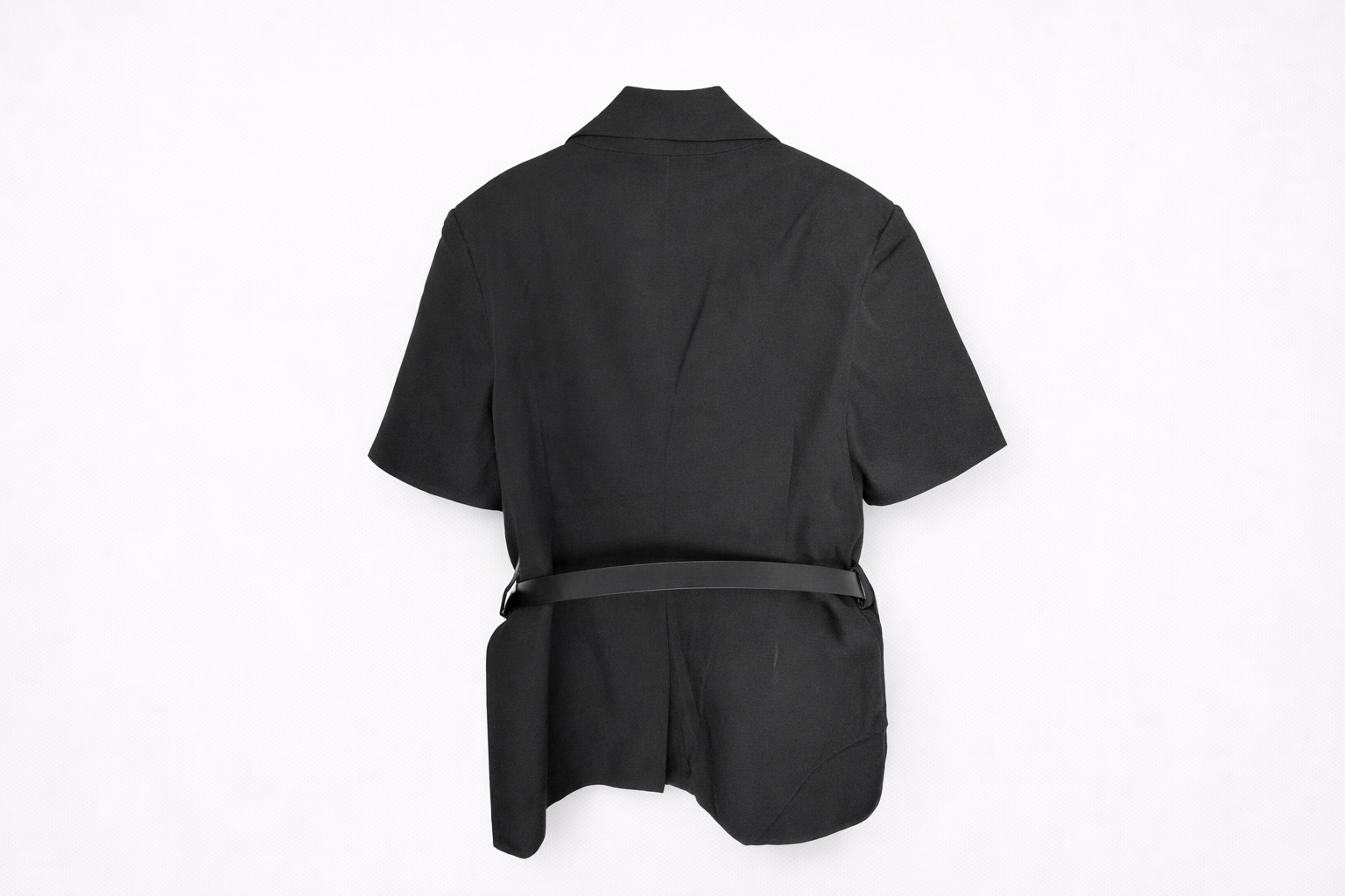 Affirmez votre style avec notre veste noire à manches courtes avec ceinture, une pièce tailleur qui allie sophistication et modernité. Sa coupe structurée et sa ceinture marquante créent une silhouette élégante et affirmée.